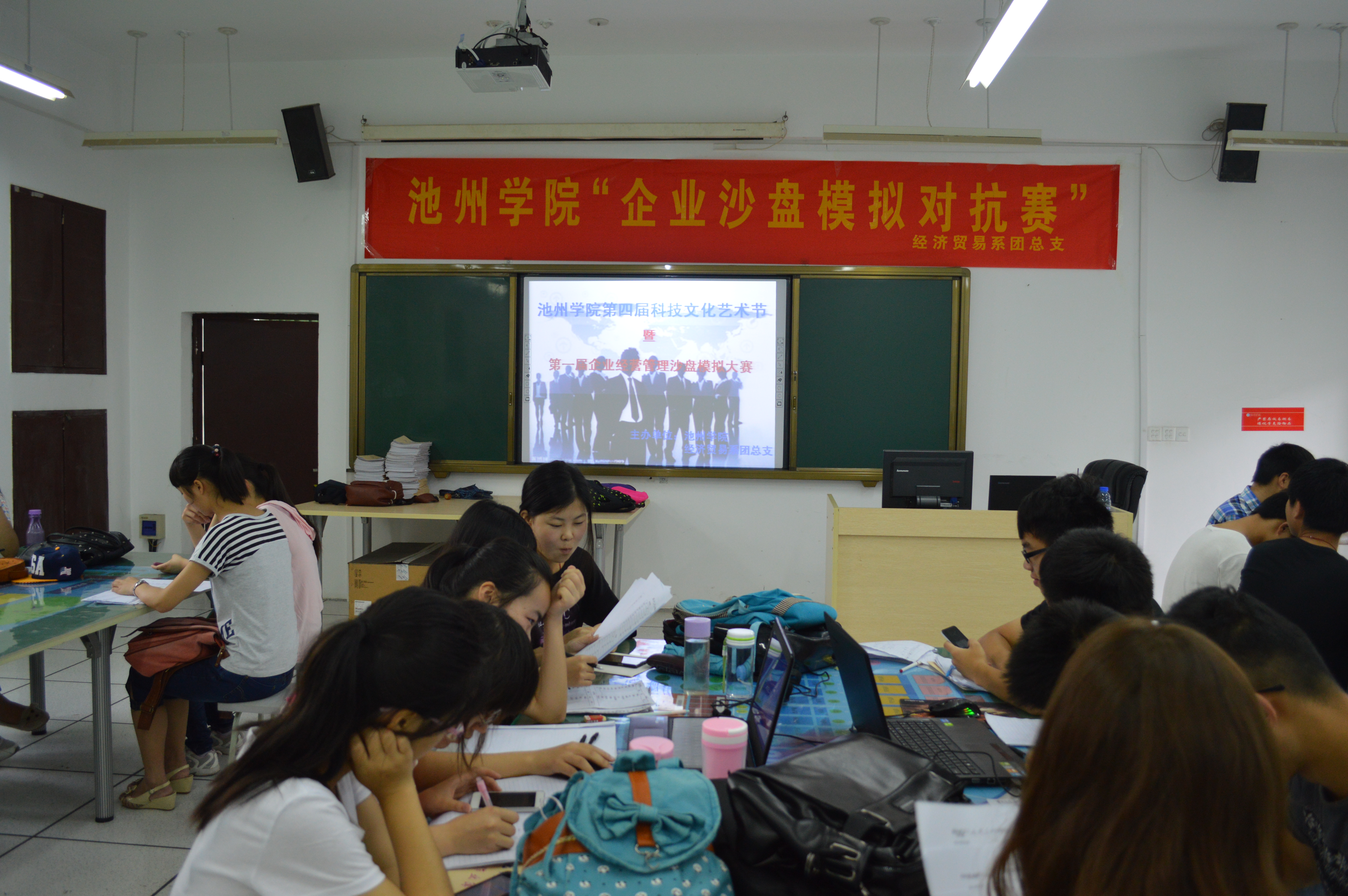 5月26日,由经济贸易系承办的校园科技文化艺术节之——“企业沙盘模拟经营”对抗赛决赛在博识北201教室举行。
