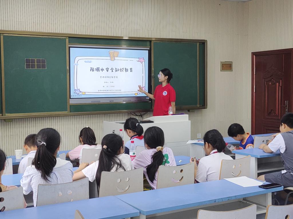 由实践团成员孔晴为员工们开展防溺水安全教育课,教育员工要做到儿童溺水防护八要点和怎样正确辨别溺水者。通过支教中开展的防溺水安全教育主题活动,能够进一步增强小朋友们的安全意识,提高他们的自我保护能力,让他们感悟到生命的可贵,也能够让他们学习到一些急救措施。希望小朋友们能度过一个愉快安全的暑假。