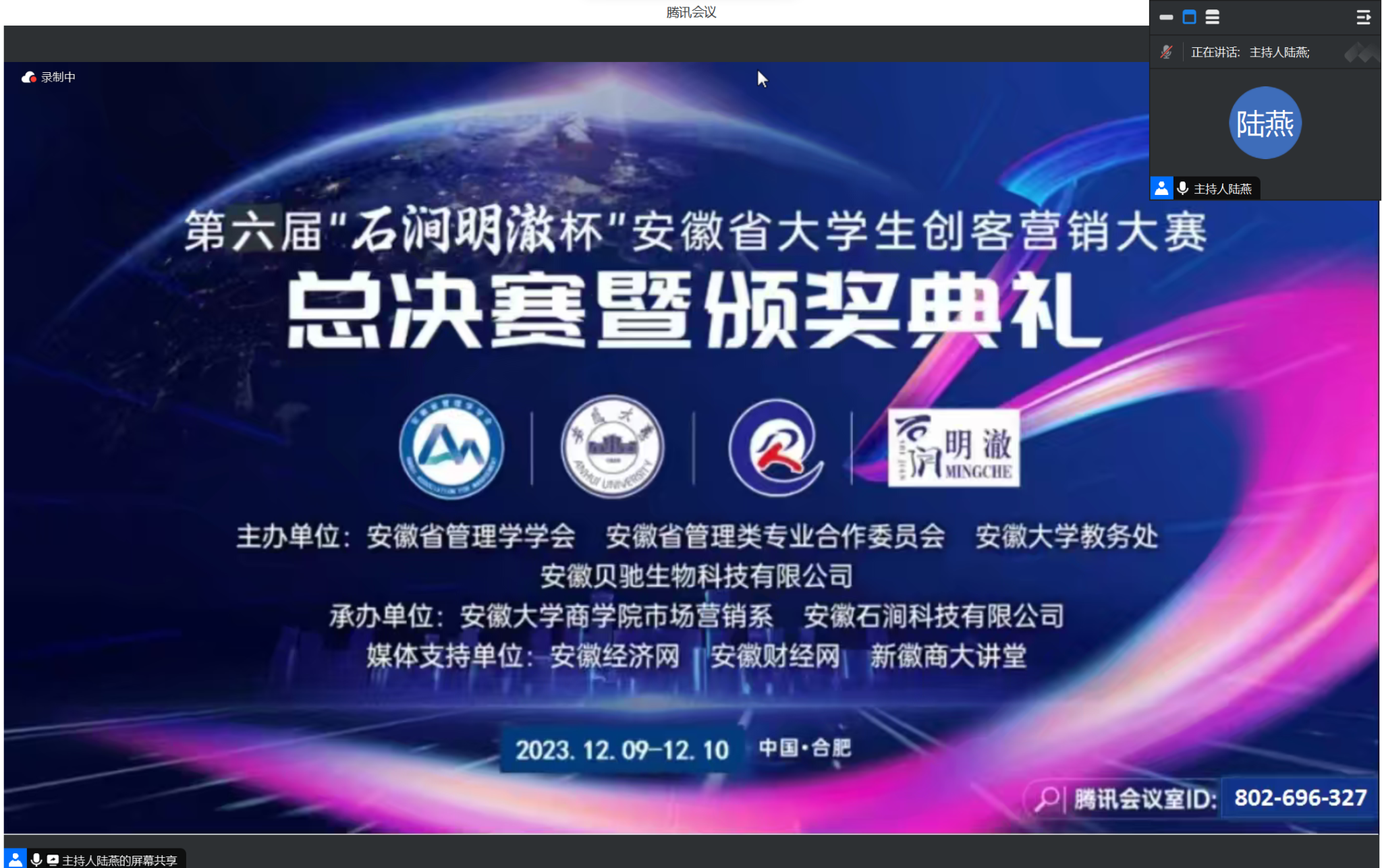 2023年12月10日,安徽省管理学学会、安徽省管理类专业合作委员会、安徽大学教务处、安徽贝驰生物科技有限公司主办,安徽大学WilliamHill体育市场营销系、安徽石涧科技有限公司承办的第六届“石涧明澈杯”安徽省老员工创客营销大赛总决赛在一片热情洋溢的氛围中于腾讯会议室云端圆满落幕。