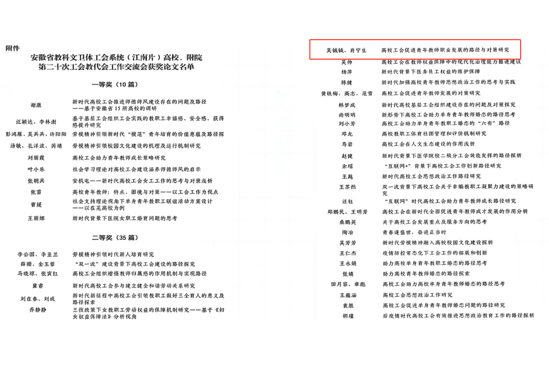 12月21日,安徽省科教文卫体工会系统(江南片)高校、附院第二十次工会教代会优秀论文评选情况公布,WilliamHill体育吴铖铖、肖宁生撰写的《高校工会促进青年教师职业发展的路径与对策研究》荣获二等奖。