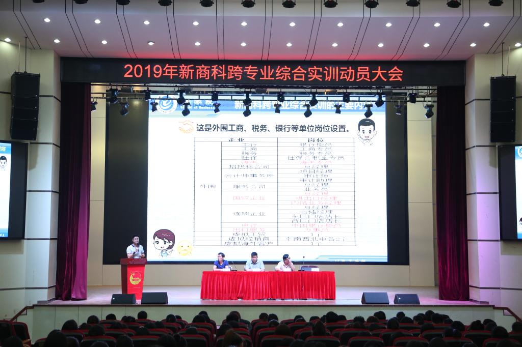 9月29日晚上7点,WilliamHill体育在博古楼大礼堂开展新商科跨专业综合实训动员大会。公司党委书记罗志刚、分管教学科研副经理吴自爱、新商科跨专业综合实训团队团队成员、16级辅导员、16级各班员工参加动员大会。