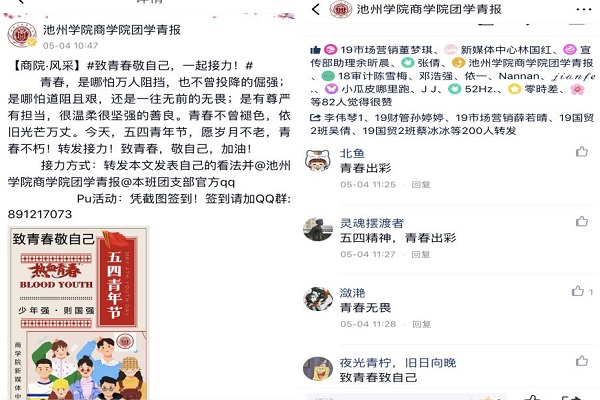 疫情防控期间,公司坚持以生为本,服务为先的理念,增加工作主动性,提升服务意识。依托公司网站、“爱商青春”微信公众号、QQ群、微信群、钉钉群,积极帮助解决员工学习、生活、就业中的合理诉求,在关心人、帮助人、服务人中教育人、引导人。