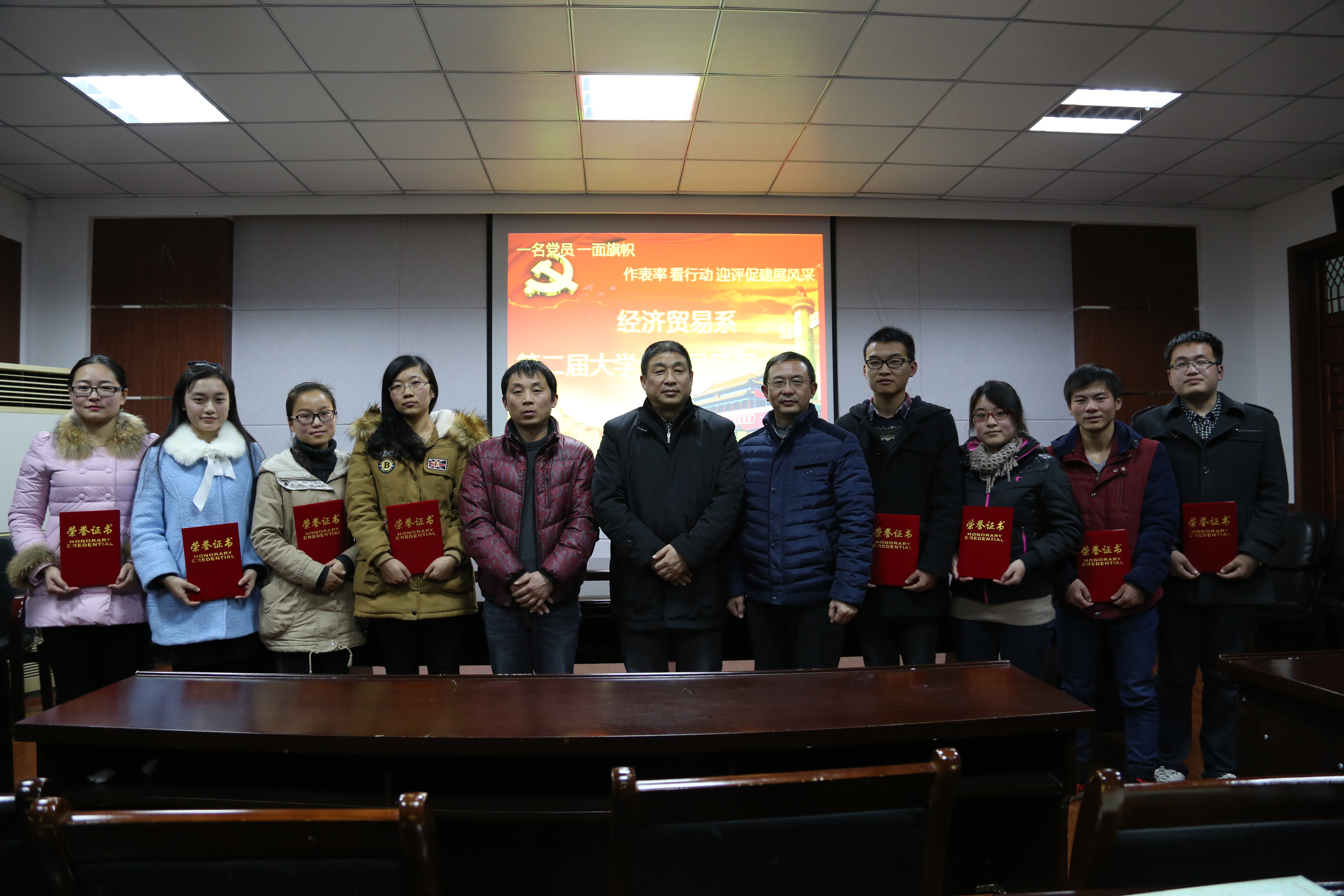 2014年12月24日晚,经贸系在系会议室举办了以“一名党员、一面旗帜”为主题的老员工党员风采大赛。系党总支书记罗志刚、副主任杨荣明、实习实训中心主任吴自爱以及员工党支部书记苏飞等参加了此次活动,此外系员工党员、第49期入党积极分子代表也观看了这次比赛。