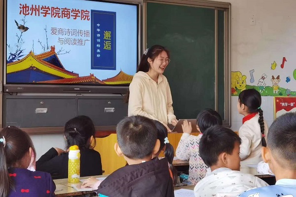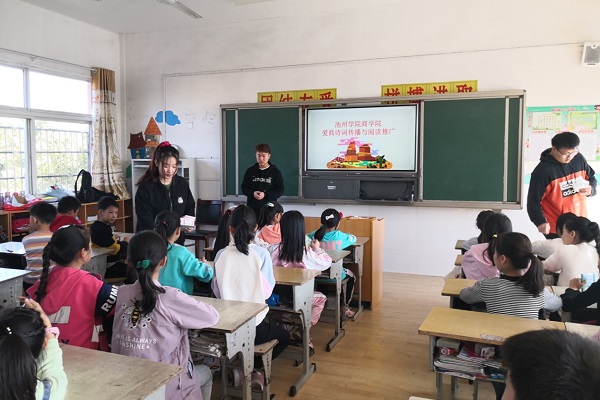 诗词传播活动中,志愿服务团带领小员工开展“励志诗词学习”活动。通过诗词旅行,感受祖国大好河山,培养孩子们的爱国情;通过讲述诗词趣事,励志诗词学习,激发留守儿童对诗词的兴趣,引导留守儿童在学习和生活中应用诗词,从诗词中汲取力量。课堂上,孩子们眨着一双双渴求知识的眼睛,积极讨论、抢答问题,师生亲密互动、气氛非常活跃。