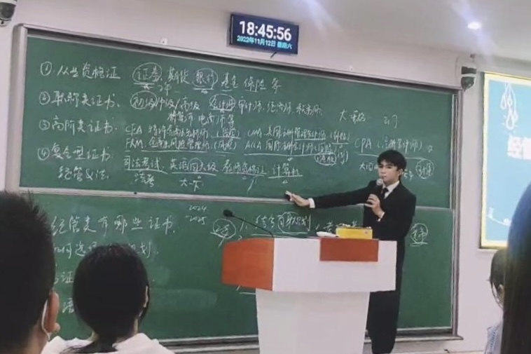 系列活动二,组织开展经管类考证咨询讲座,主讲人张群同学(公司17级员工,民商法学研究生)将经管类证书分为“从业资格证”“职称类证书”“高阶证书”“复合型证书”等四大方面,列举了三十余种证书的名称、报考条件、应用场景等。并以初会、银从为例,讲解了考试内容、知识体系架构,以及各个阶段的复习备考方法。