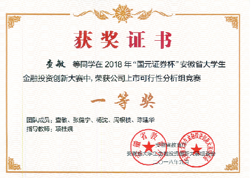 本届大赛在三个项目组展开角逐,分别为股票虚拟仿真交易组、金融投资策略设计组、公司上市可行性分析组,全省66所高校,65000余人次报名参加了本次赛事。公司共有180个团队报名参加校赛,并有40个团队成功进入省赛。决赛环节,经过专家评审,查敏团队作品《合肥立方制药股份有限公司上市可行性分析》(指导老师:项桂娥)获得公司上市可行性分析组一等奖(排名13位),伍郑超团队(指导老师:曹雪峰)、张瑶团队(指导老师:章麓)获得股票虚拟仿真模拟交易组一等奖。此外,还有7支团队获得省赛二等奖,17支团队获得省赛三等奖。