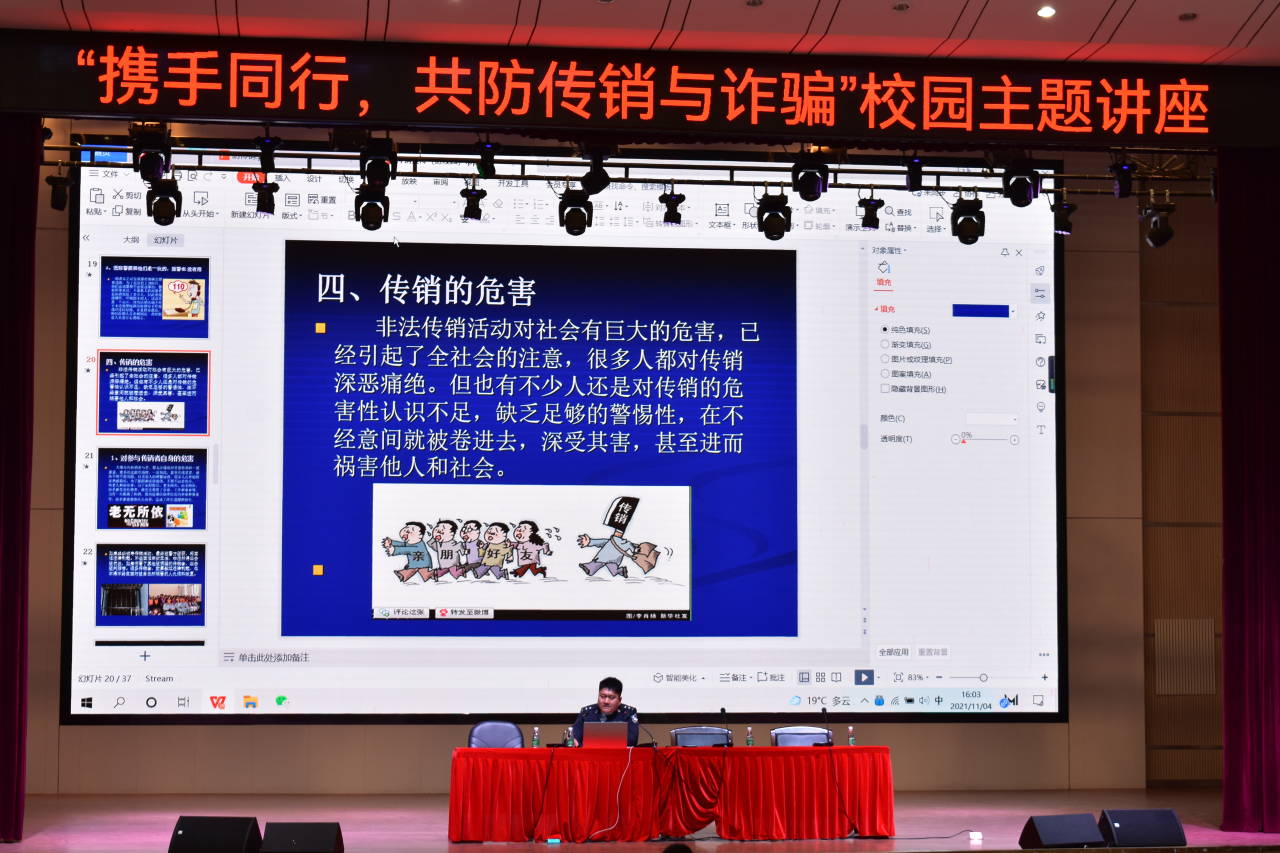 为切实维护公司师生的生命财产安全,落实关于开展2021年校园防范传销宣传教育暨全省禁止传销宣传月活动要求,预防相关违法犯罪活动向校园渗透,11月4日下午,WilliamHill体育于博古礼堂开展了“携手同行,共防传销与诈骗”主题讲座。池州市贵池区刑警大队民警吴彦伯应邀主讲,超过200位师生现场聆听了讲座。公司党委副书记肖宁生、公司行政(员工)办公室主任胡刚、团委负责人王琴出席了讲座。