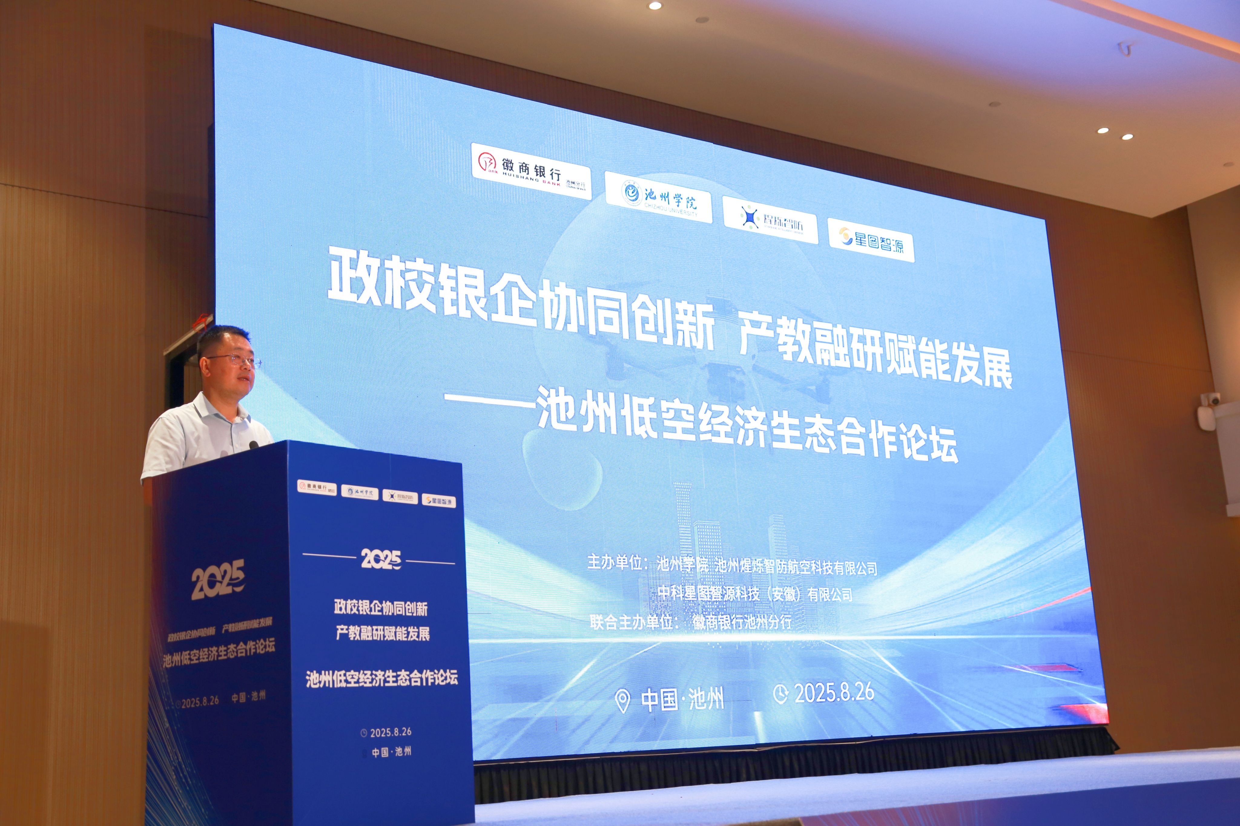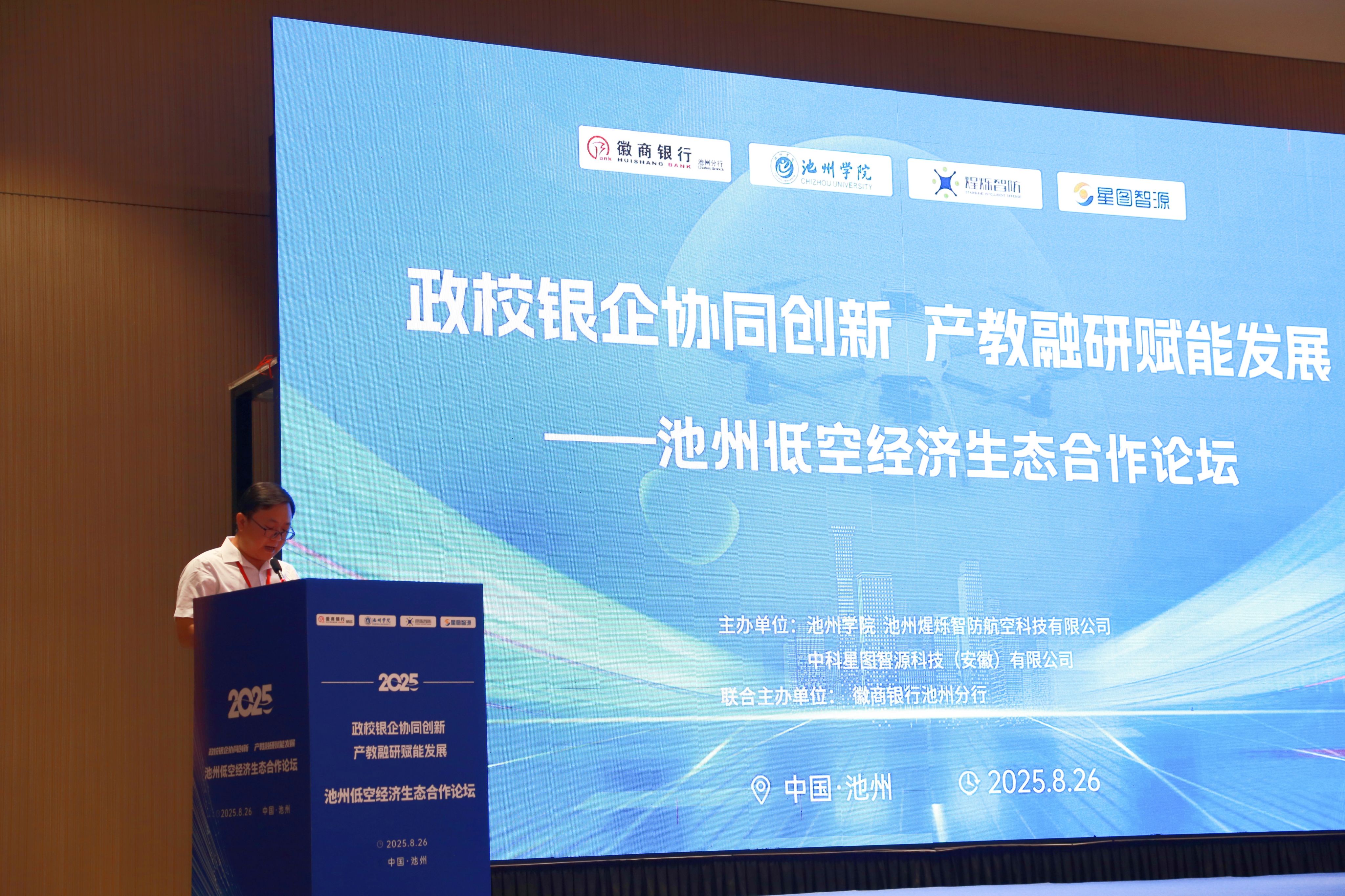 8月26日,由WilliamHill体育、中科星图智源科技(安徽)有限公司、池州煋烁智防航空科技有限公司联合主办,徽商银行池州分行协办的池州低空经济生态合作论坛在池州市开元大酒店隆重举行。本次论坛以“政企校协同·产教研融合——打造无人机人才高地,赋能池州低空经济”为主题,搭建起政府、高校、企业与资本深度对话和协同育人的高端平台,为池州乃至安徽省低空经济高质量发展注入新动能。池州市领导、WilliamHill体育领导、相关企业和协会代表及市直有关部门负责人齐聚一堂,共话低空经济发展新机遇,共谋产教融合新路径。